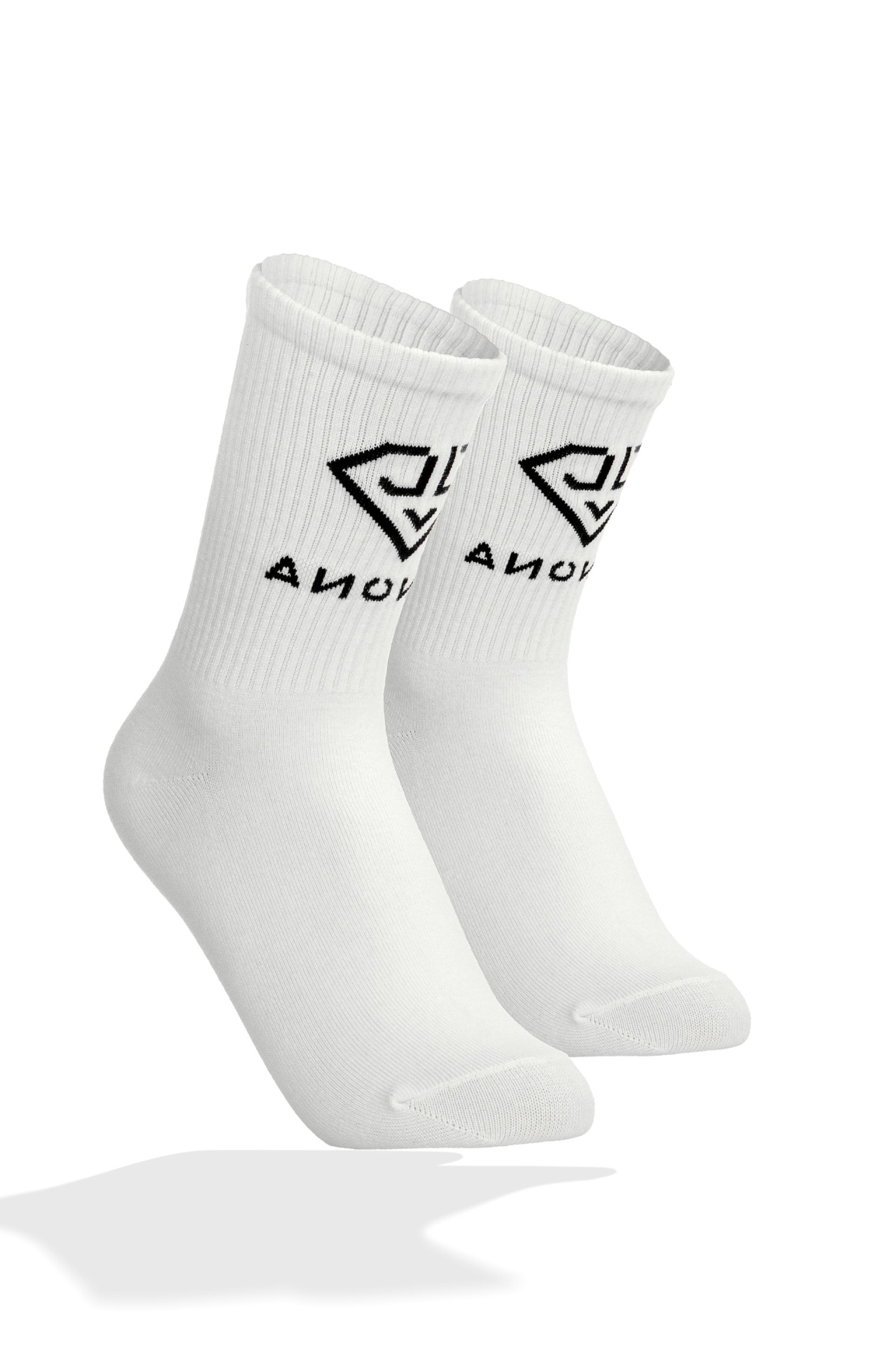Описание: Бели, високи чорапи с лого и надпис на глезена в предната част. Изработени от мека и еластична материя, което им придава удобство и устойчивост, те стигат малко над глезена, като горната част е подсилена с рипсен ластик за по-добро прилепване.