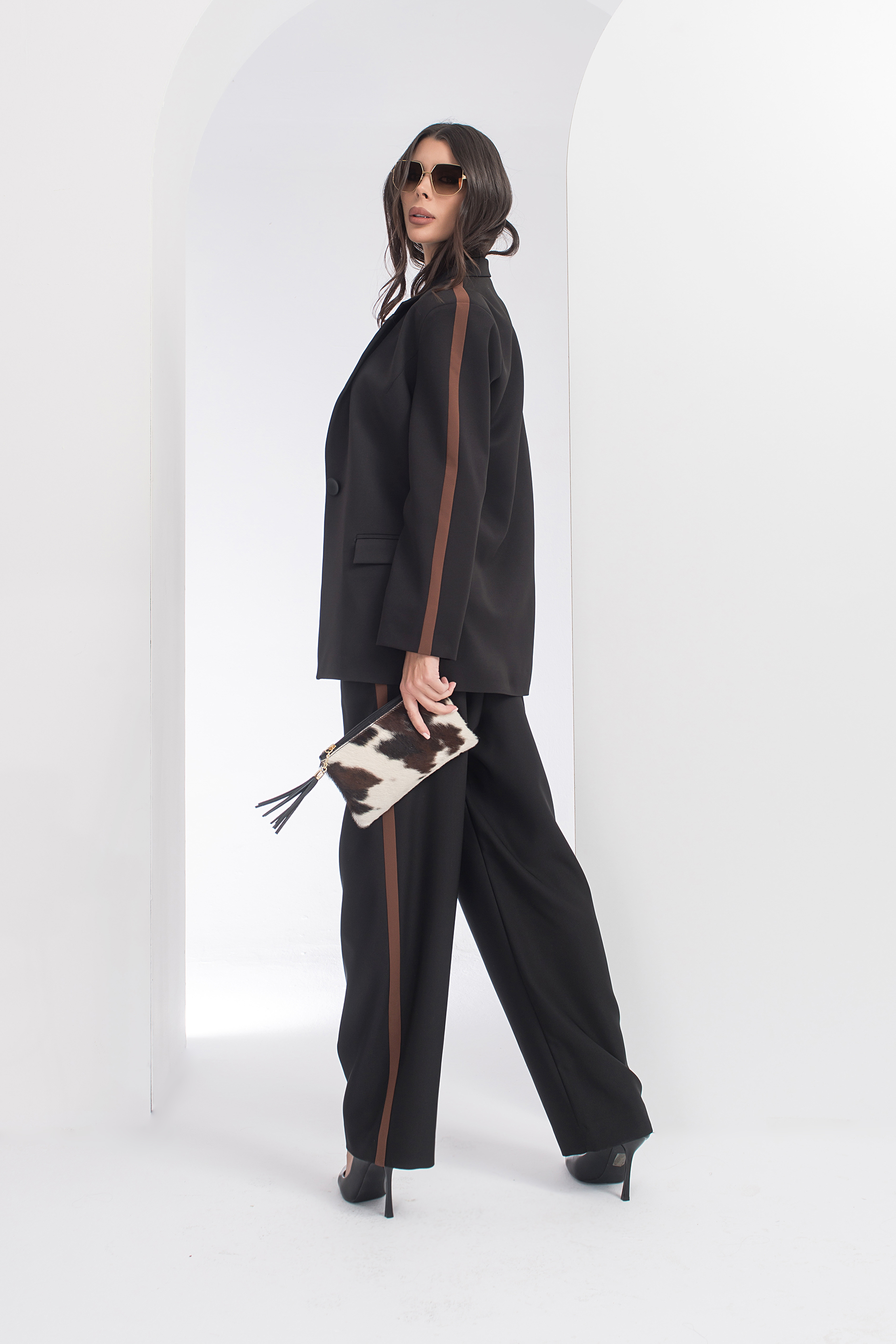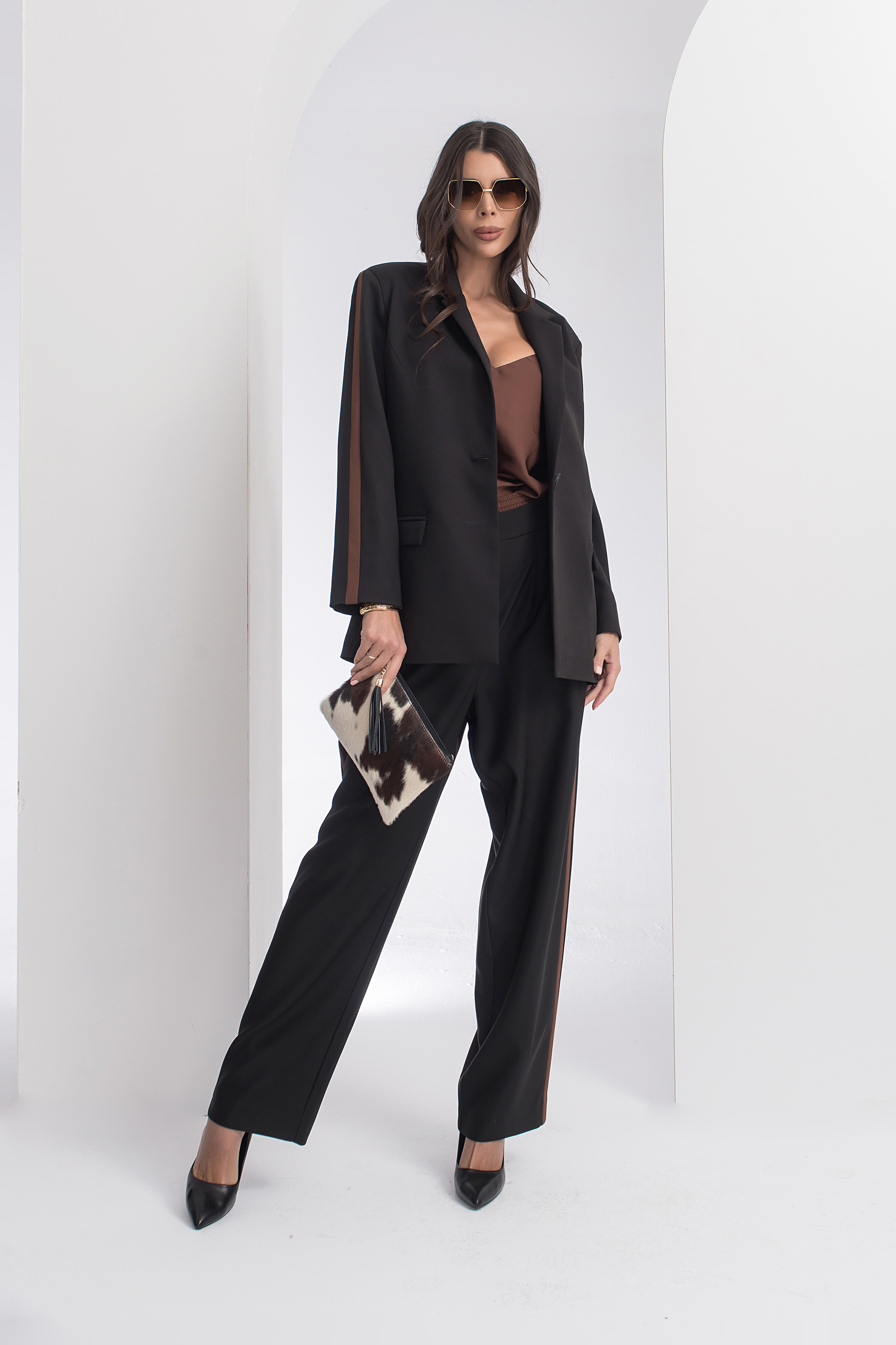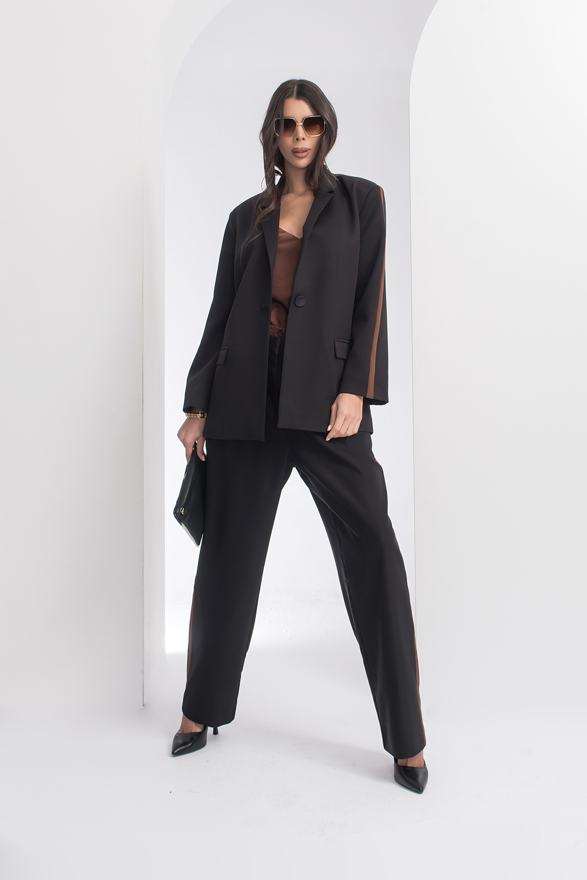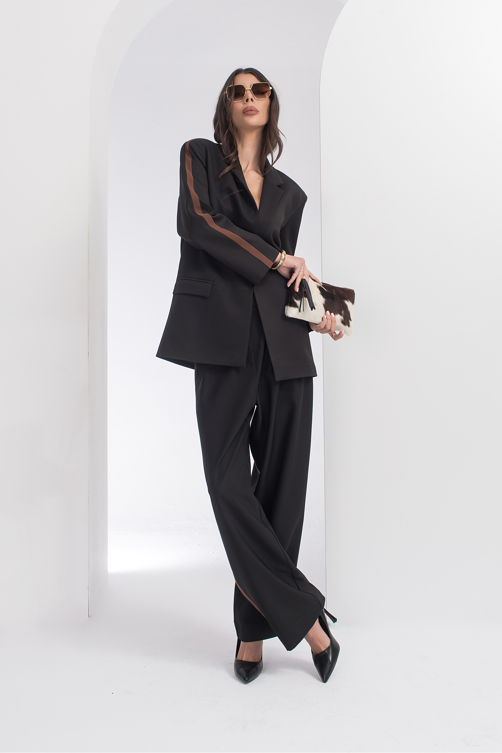 Описание: Елегантно сако със свободен силует с яка с ревери и дълъг ръкав. Артикулът е с предни джобове с капаче и закопчаване с копчета отпред. Акцент кантове.