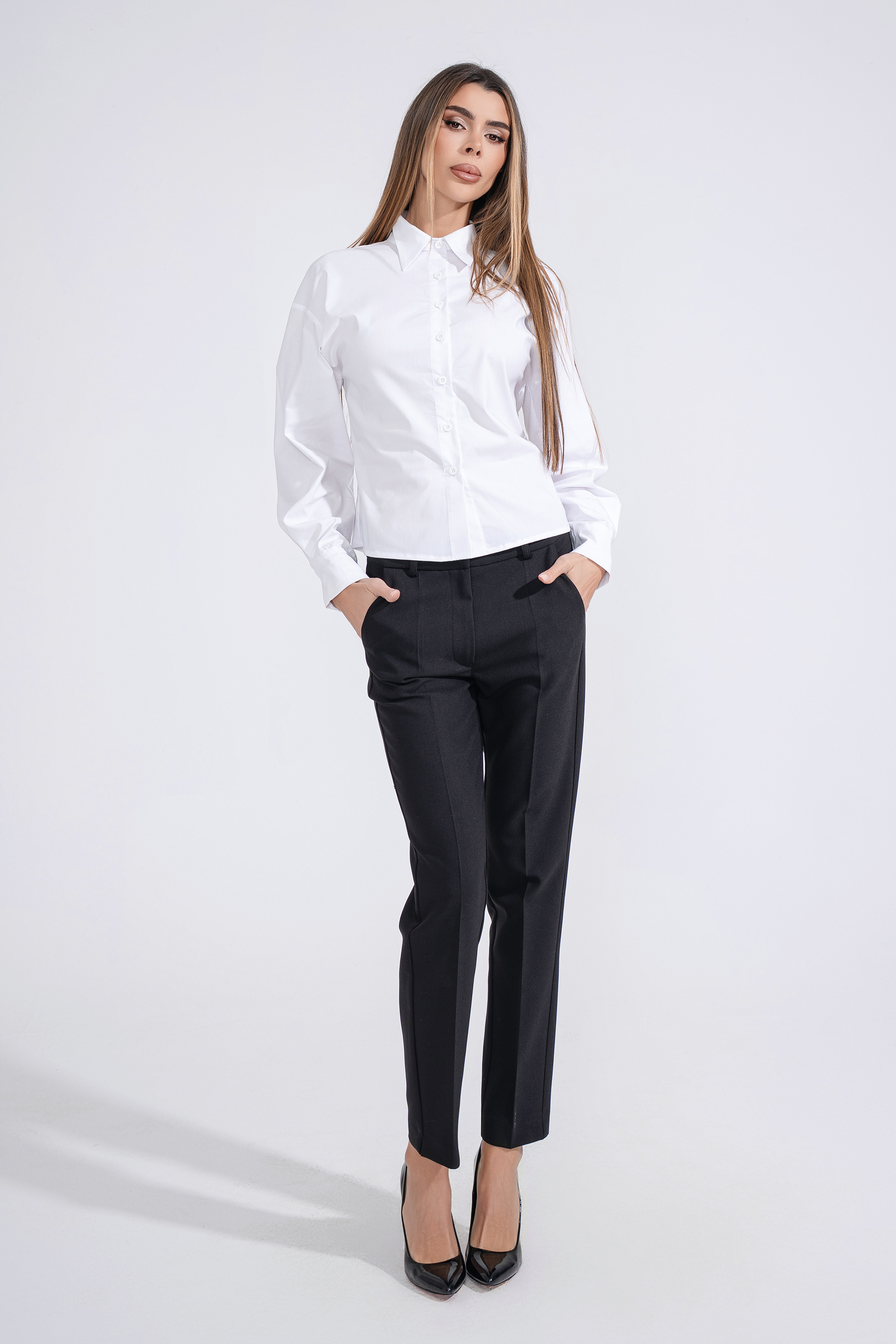 Панталон със средна талия и стеснен крачол с ръб. Странични джобове и задни джобове с филетка. Закопчаване отпред с цип, копче и метални кукички.