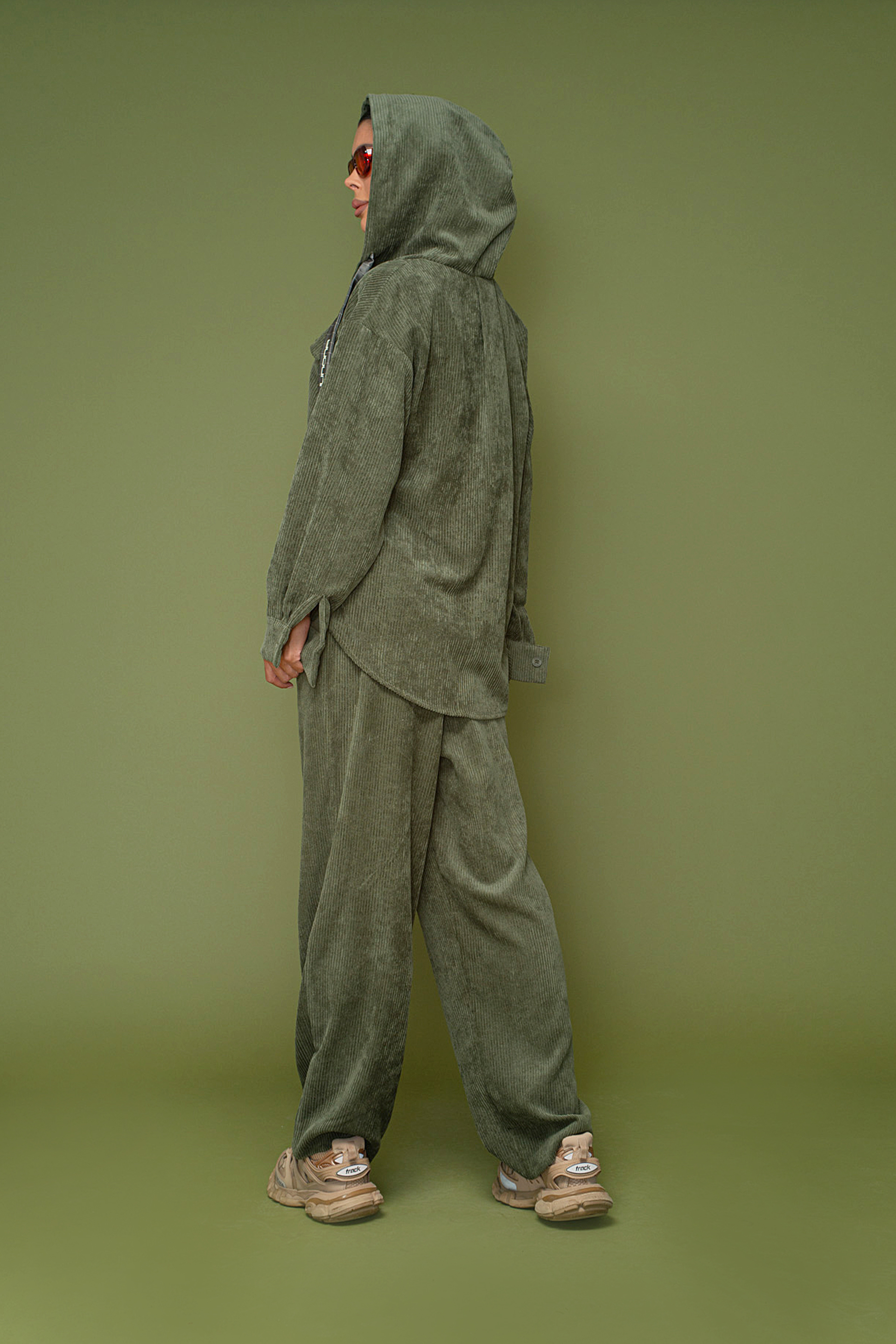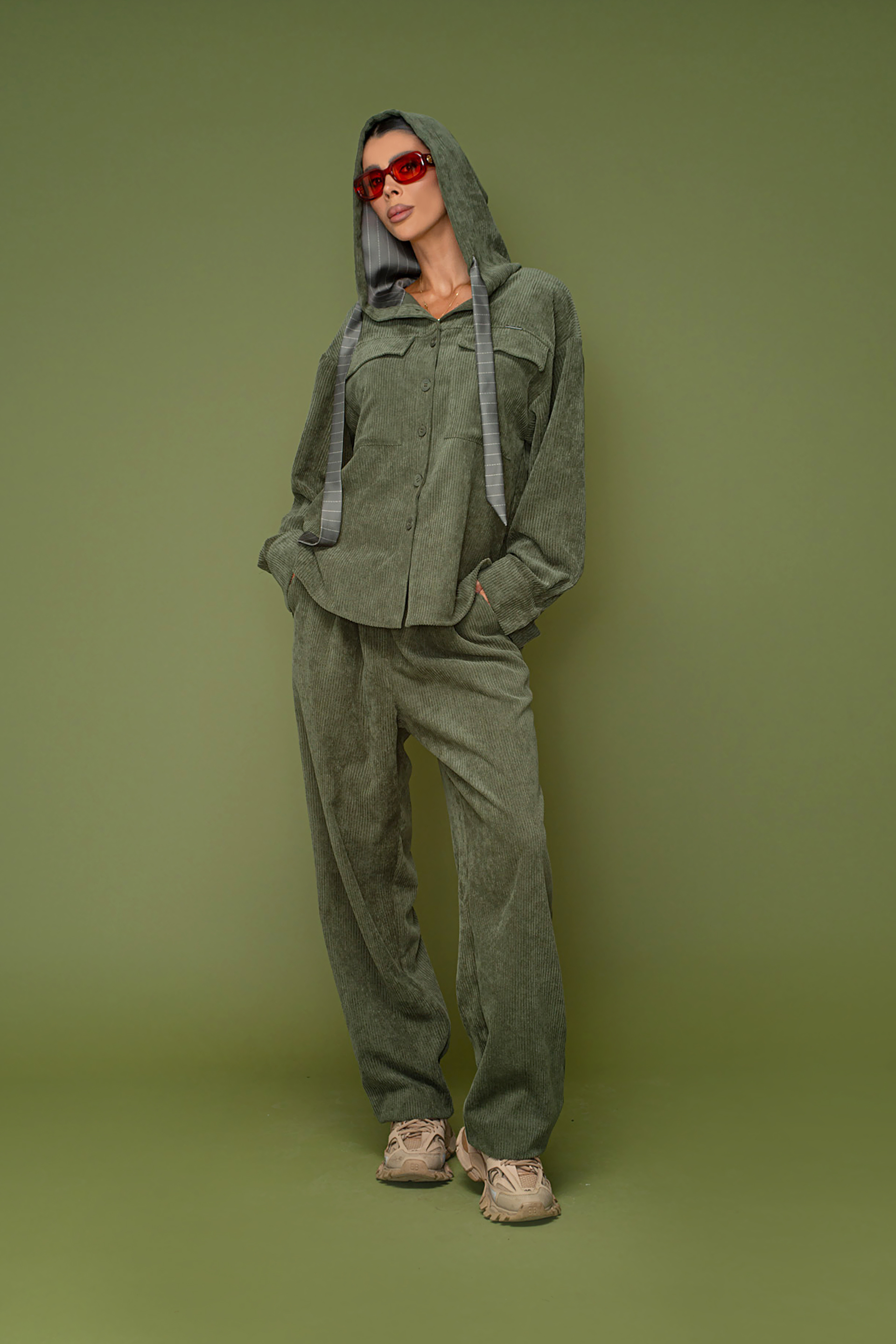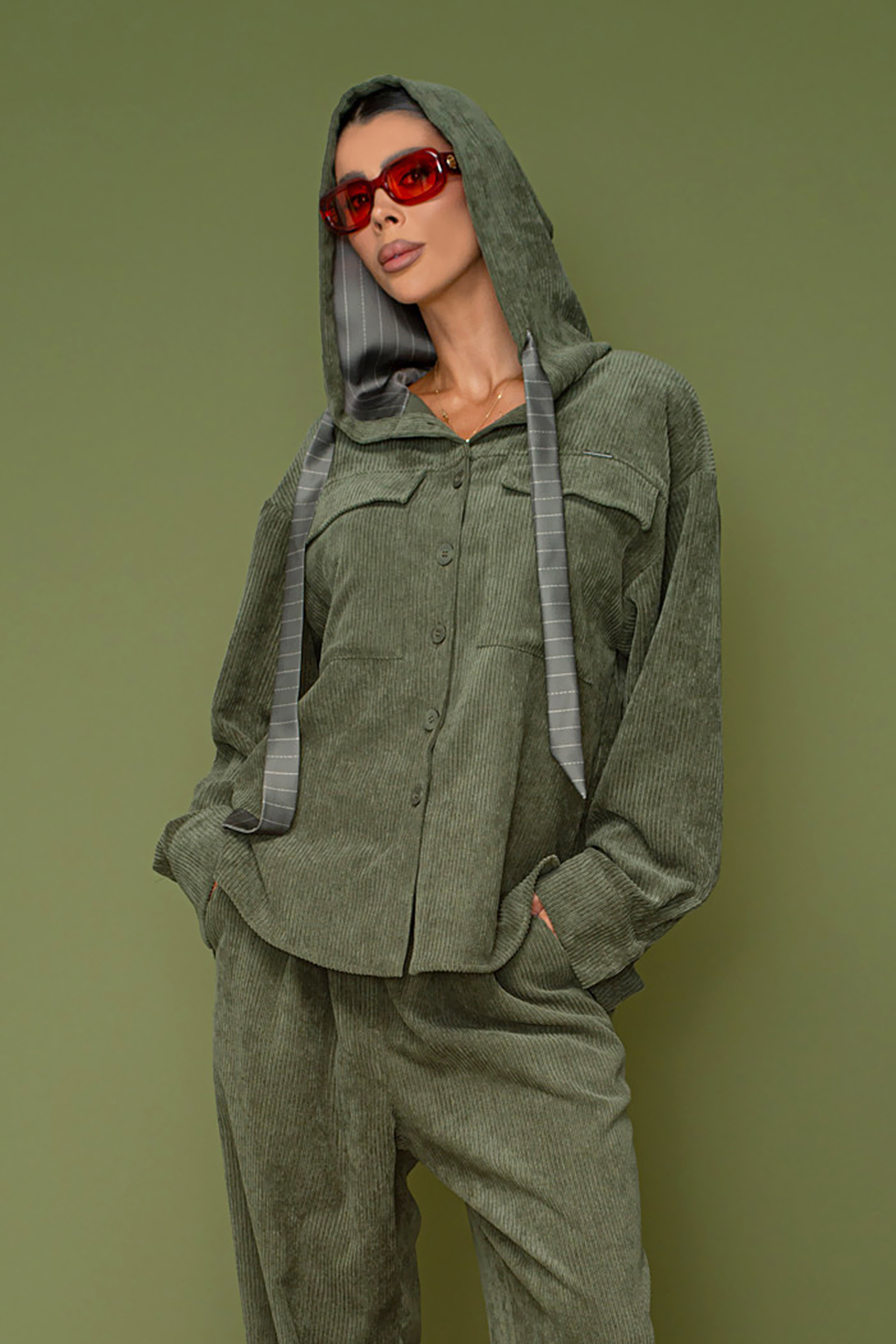 Описание: Риза със свободна кройка, дълъг ръкав и удължена задна част. Изработена от меко рипсено кадифе.Акцент качулка с връзки. Закопчаване с копчета отпред.