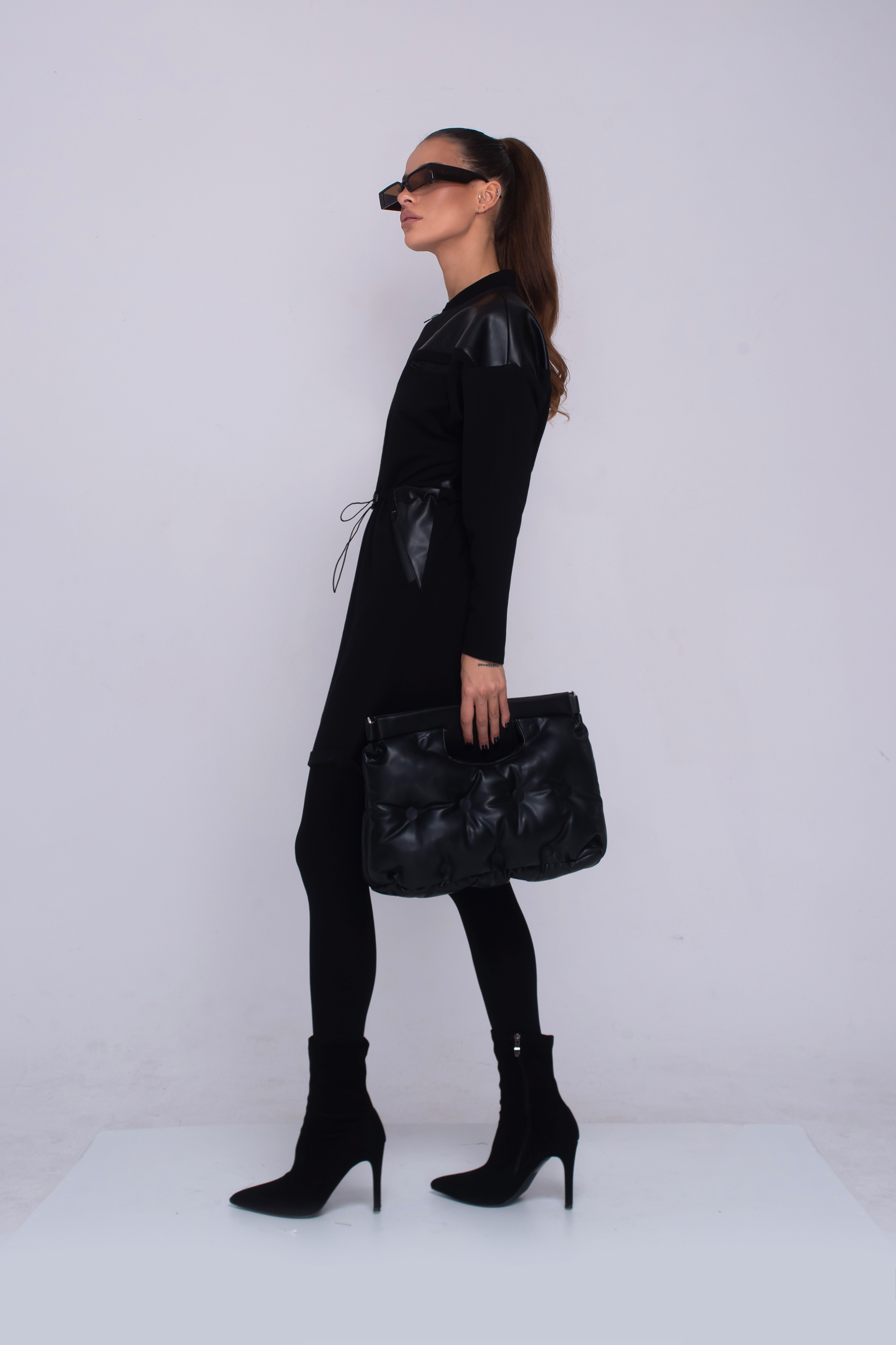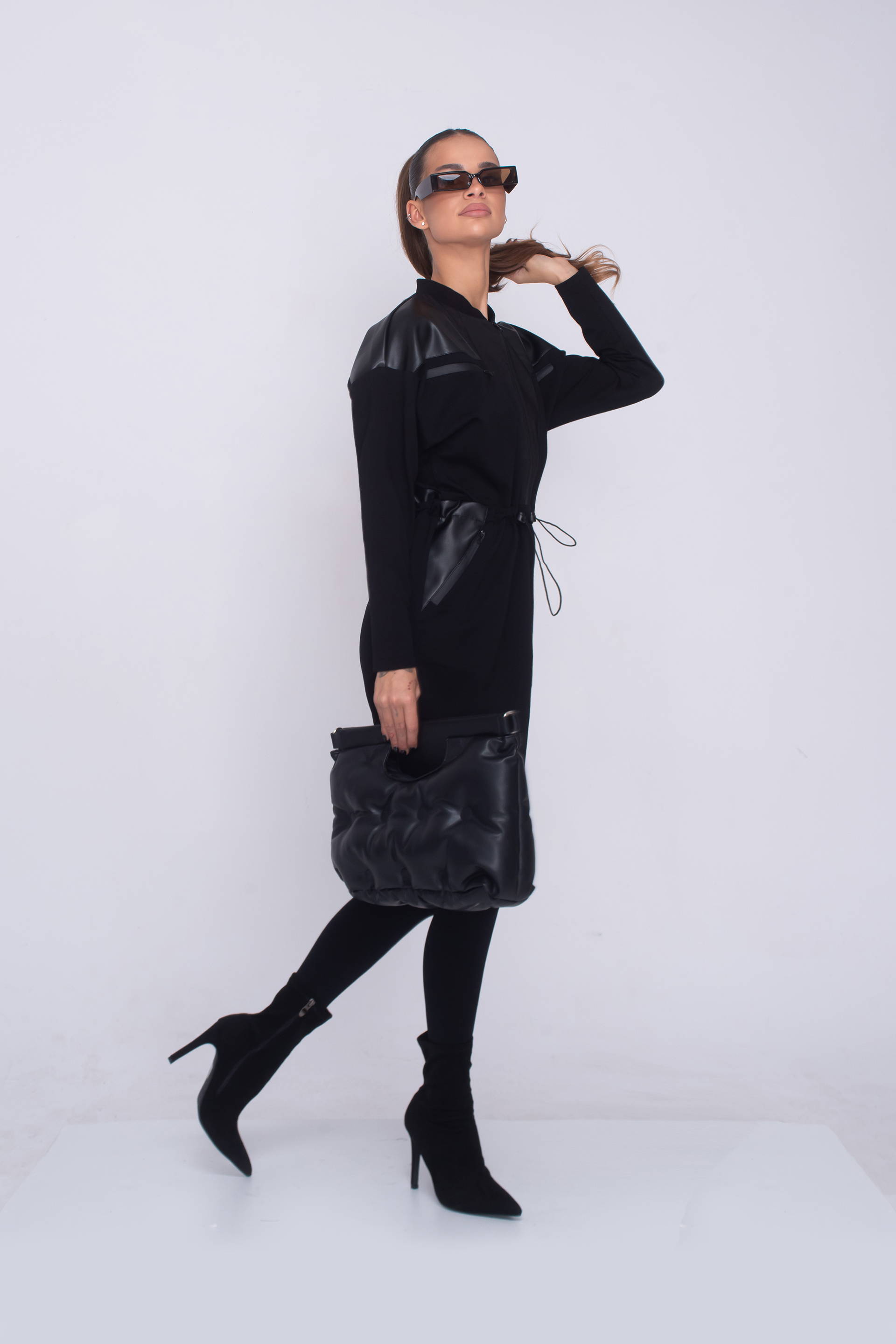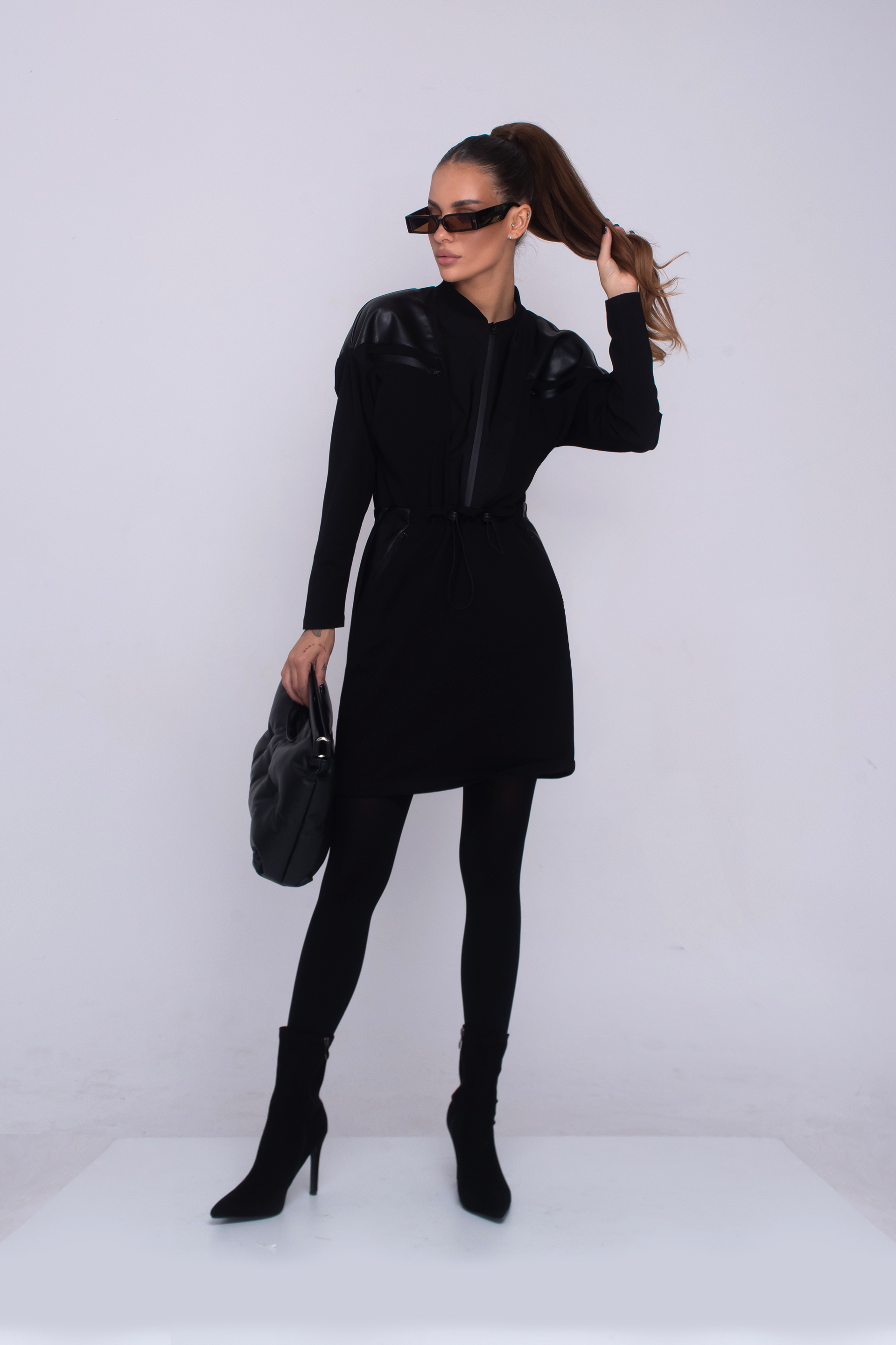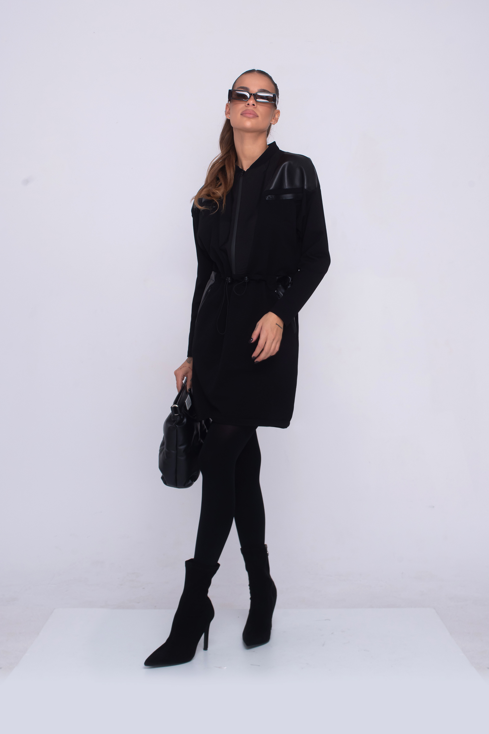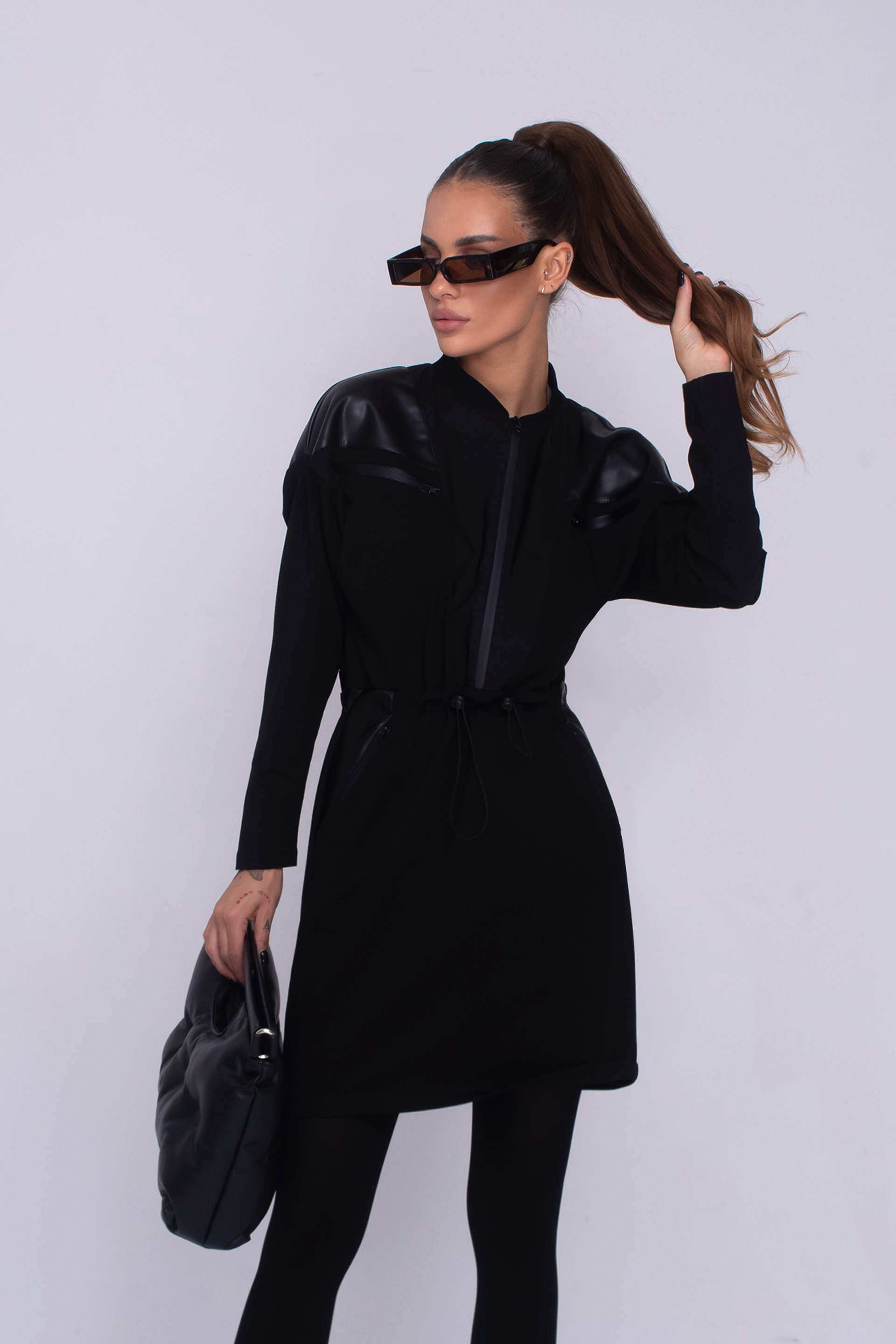 Описание: Рокля със свободен силует, падащ до средата на бедрото, джобове с цип, детайли от еко кожа, дълъг ръкав и обло деколте. Артикула е с закопчаване с цип, в предната част и регулируема, ластична връзка, в областта на талията.
